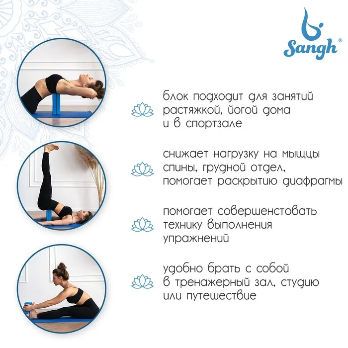Йога-блок (йога-кирпич) нужен для создания дополнительной точки опоры. Он помогает развивать гибкость постепенно, без лишнего напряжения в мышцах и суставах. Необходим для тех, кто только начинает заниматься йогой, и кому не достает гибкости, чтобы иметь правильную опору для рук и ног при выполнении асан.