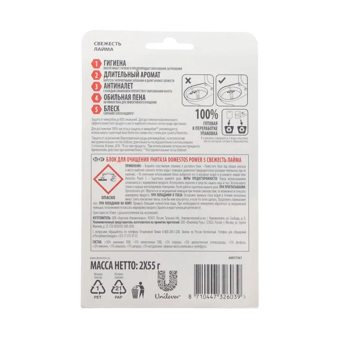 Domestos Сила 5 – это эффективное средство, которое содержит в себе не один, а целых пять преимуществ, обеспечивающих защиту от загрязнений, а значит и микробов. При использовании блоков Domestos Сила 5 каждое смывание – заряд свежего аромата лайма, который остается в течение длительного времени – до 4х часов. Больше никакого налета на внутренней поверхности унитаза – блок Domestos Сила 5 успешно справляется с данной задачей. Смывание за смыванием блок оставляет обильную пену и аромат, борется с налетом, поддерживает чистоту, оставляя поверхность унитаза блестящей.