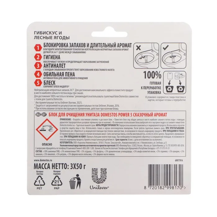 Этот продукт предназначен для использования на унитазах и других поверхностях в ванной комнате. Он легко устанавливается на унитаз и начинает работать автоматически при каждом смывании. Блок для очищения унитаза DOMESTOS Power 5 TRIO гибискус и лесные ягоды 150 гр обеспечивает эффективное очищение и дезинфекцию, а также приятный аромат в ванной комнате.