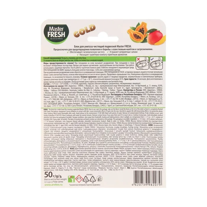 Блок для унитаза Master FRESH, DUO EFFECT 5в1 формула GOLD, тропик, 1 шт - это инновационное средство для поддержания чистоты и гигиены в ванной комнате. Он предназначен для использования на унитазах и других поверхностях, обеспечивая эффективное очищение и дезинфекцию. Блок содержит активные компоненты, которые удаляют пятна и загрязнения, а также уничтожают бактерии и вирусы. Он имеет приятный аромат тропических фруктов, который освежает воздух в ванной комнате.