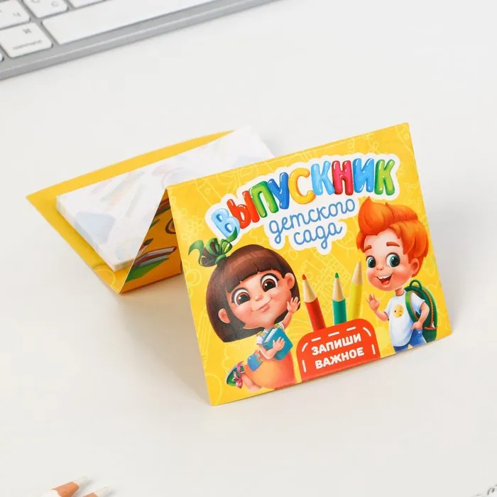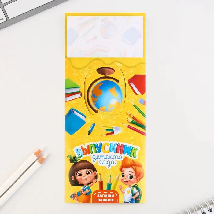 Блок бумаги для записей с отрывными листами поможет фиксировать важную информацию и интересные идеи. Блок бумаги имеет фигурный вырез и интересный дизайн ,он отлично подойдет на подарок выпускникам детского сада .