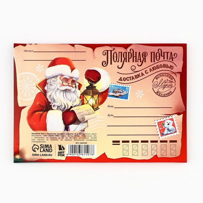 Блок для записей с отрывными листами, в открытке, 30 л. «Новый год: Почта счастья» — Характеристики