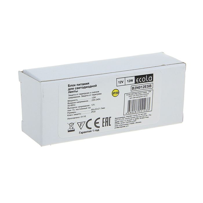 Блок питания Ecola для светодиодной ленты 12 В, 12 Вт, IP20 — Характеристики