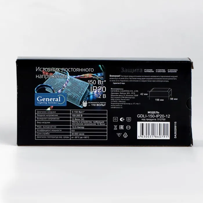 Блок питания General для светодиодной ленты 12 В, 150 Вт, IP20 — Характеристики