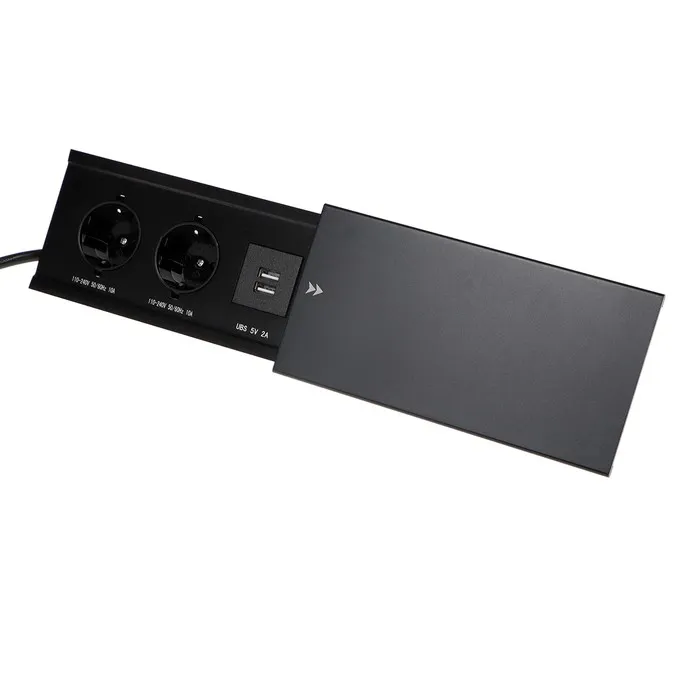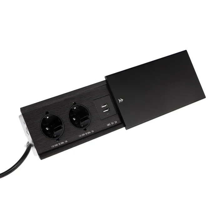 Блок розеточный в стол, сдвижная крышка, 10А, 2 розетки, 2xUSB, 2A, провод 1.8 м, черный — Характеристики