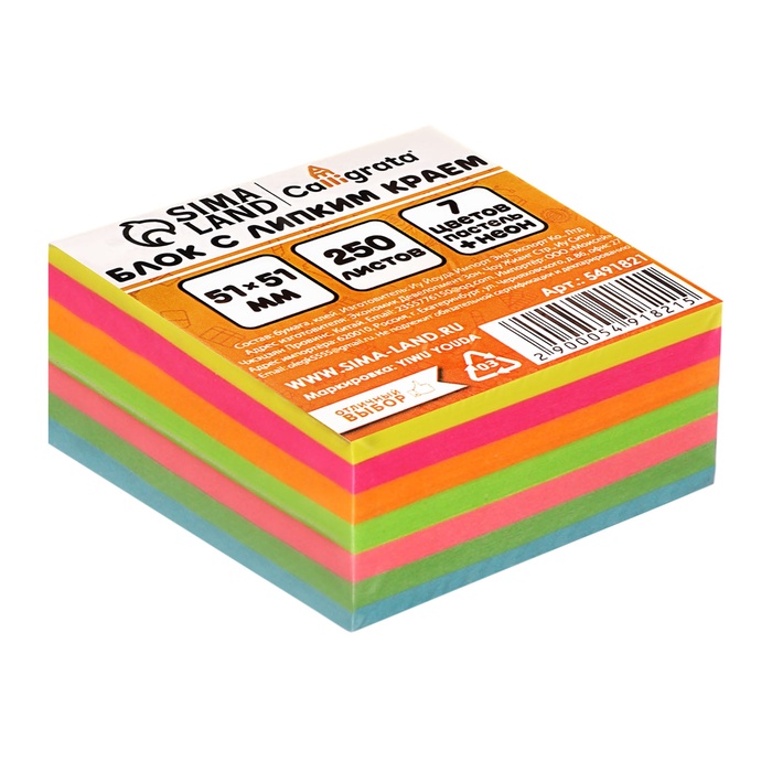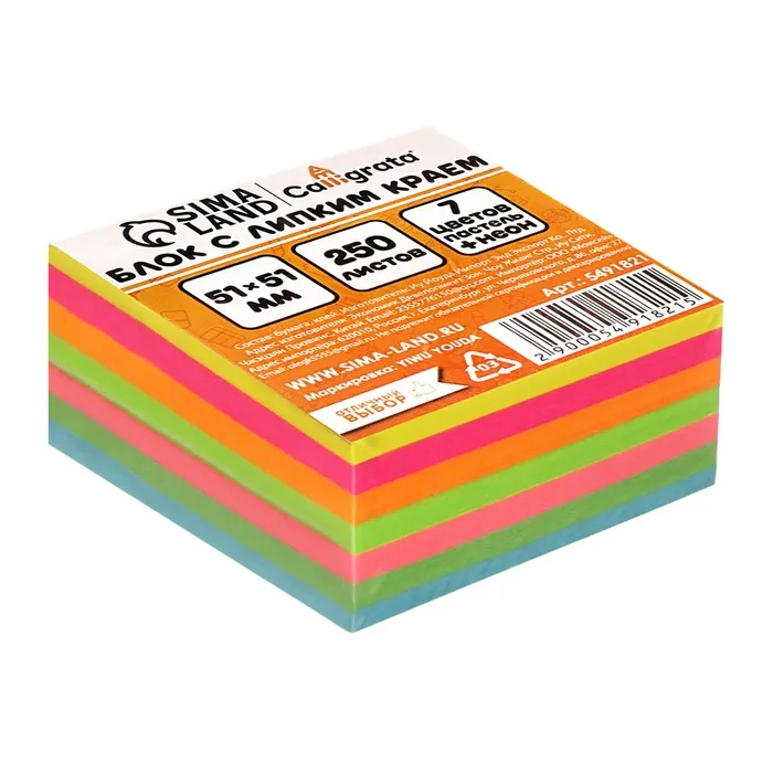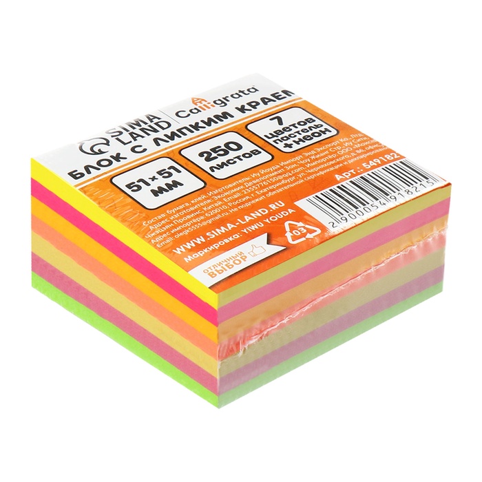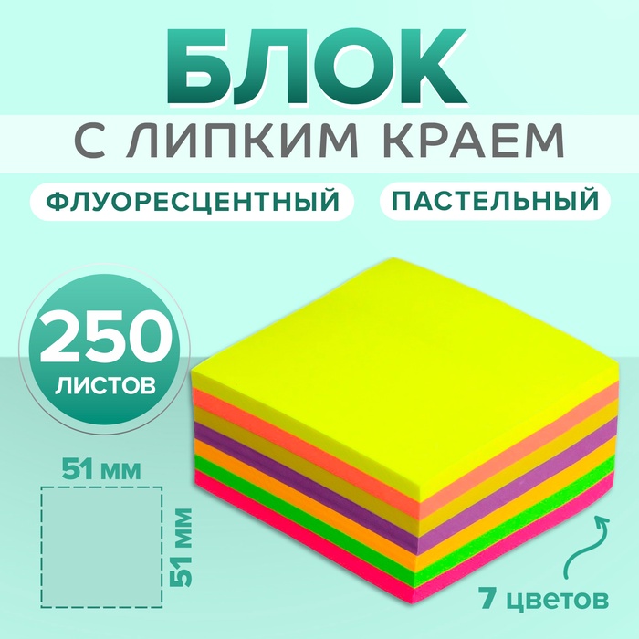 Блок с липким краем, 51×51 мм, 250 листов, 7 цветов пастельные+флуоресцентные — Характеристики