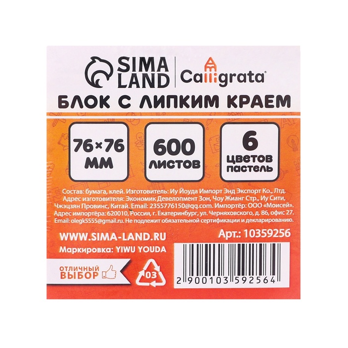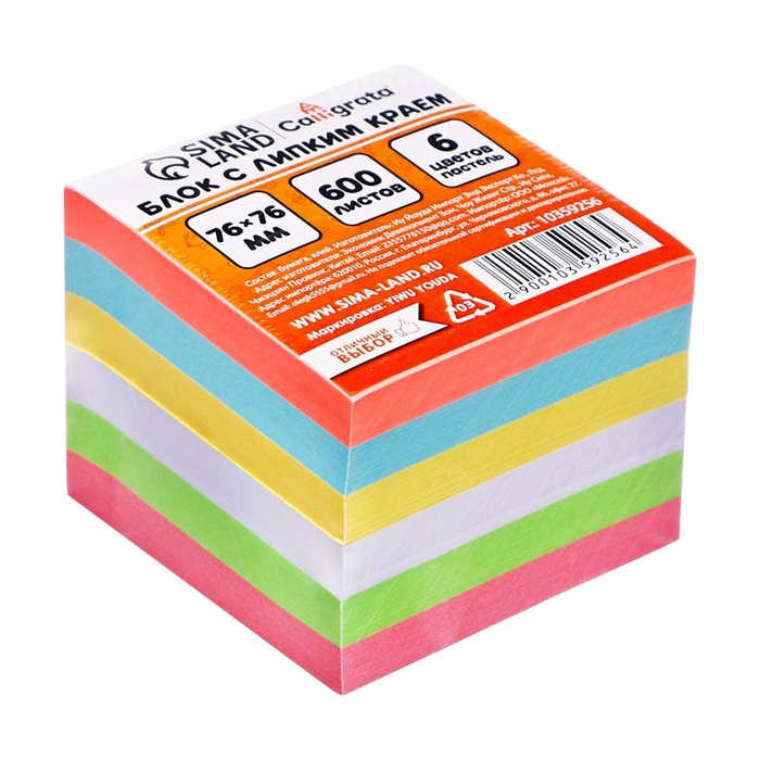 Блок с липким краем 76мм*76мм 600л, 6 цветов — Характеристики