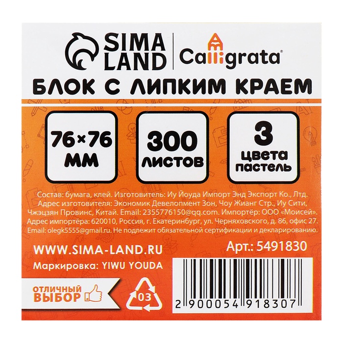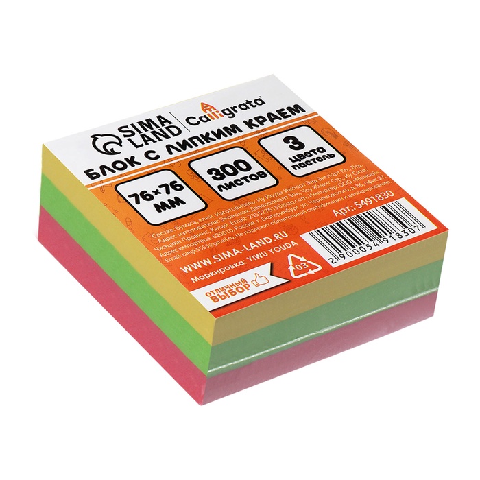 Блок с липким краем, 76×76 мм 300 листов, пастель, 3 цвета — Характеристики