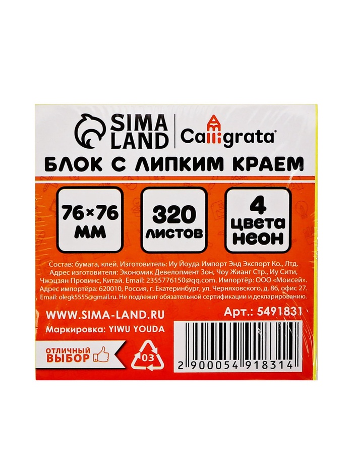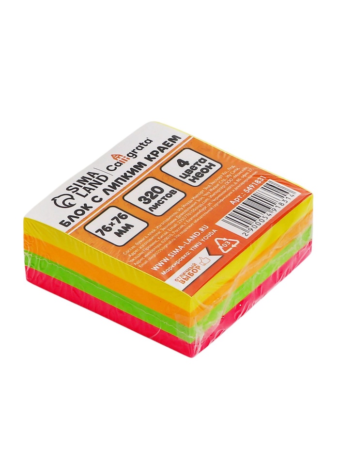 Блок с липким краем, 76×76 мм, 320 листов, флуоресцентный, 4 цвета — Характеристики