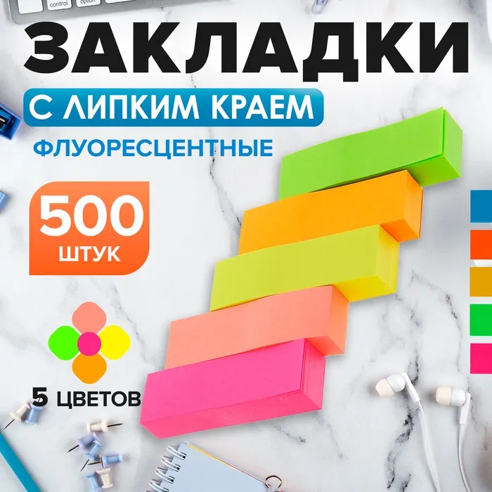 Блок - закладка с липким краем, 50×15 мм, 5 цветов по 100 листов, флуоресцентный, МИКС — Характеристики