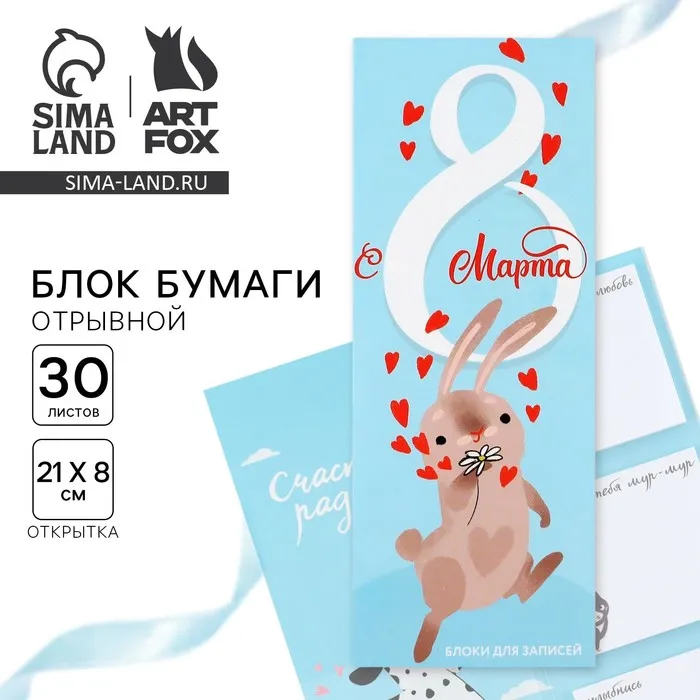 Блоки бумаги с отрывными листами, 30 л в открытке «Заяц. 8 марта» — Характеристики