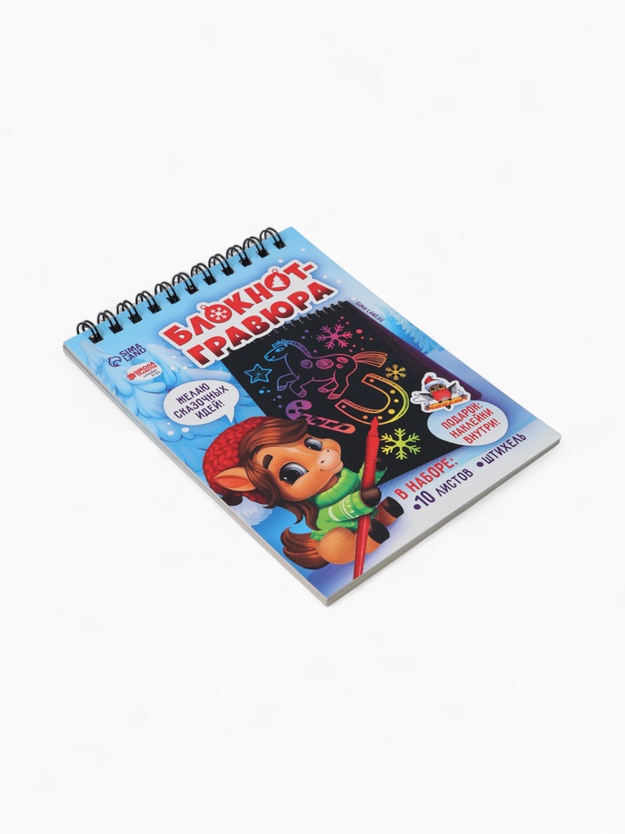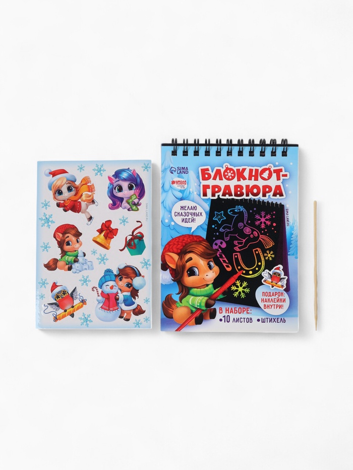 Блокнот-гравюра «Новогодние лошадки», 10 листов, лист наклеек, штихель, формат А6 — Характеристики