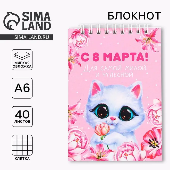 Блокнот на гребне, А6, 40 л. в клетку, мягкая обложка «Котик. 8 марта» — Характеристики