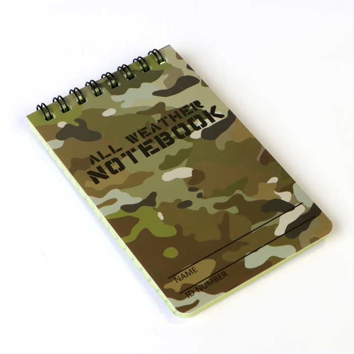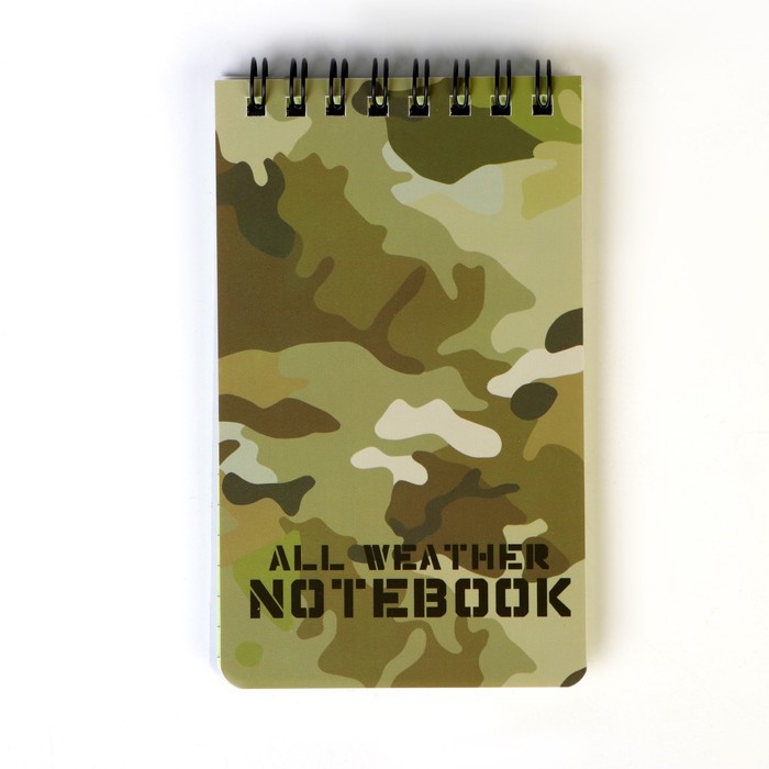 Листы влагостойкого блокнота выполнены из бумаги со специальным покрытием, которое позволяет ему выдерживать неблагоприятные погодные условия. Блокнот также устойчив к поту и грязи.