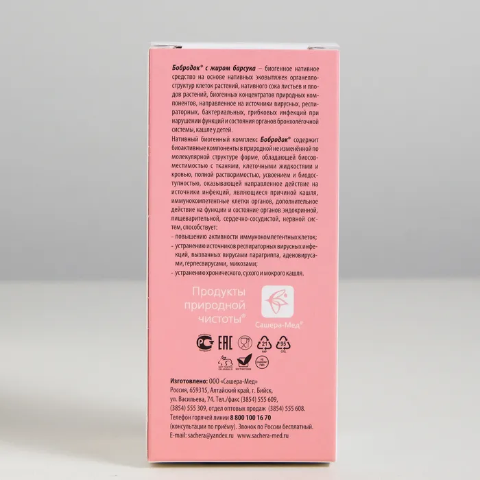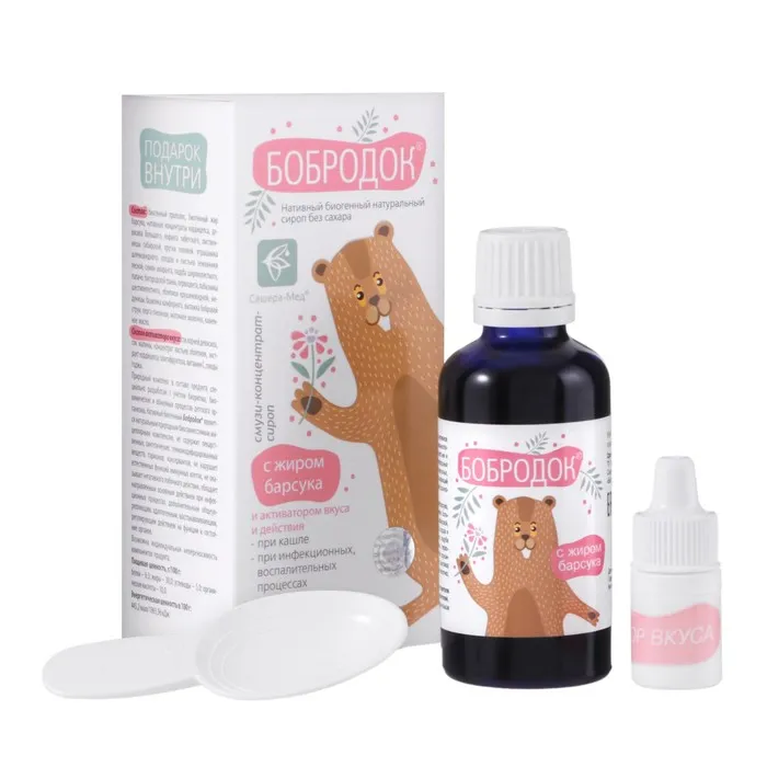Бобродок с жиром барсука, смузи-концентрат-сироп – биогенное натуральное средство на основе нативных эковытяжек органелло-структур клеток растений, нативного сока листьев и плодов растений, биогенных концентратов природных компонентов, направленное на источники вирусных, респираторных, бактериальных, грибковых инфекций при нарушении функций и состояния органов бронхолёгочной системы, кашле у детей, рекомендованное для профилактики и укрепления иммунитета в период обострения эпидемии гриппа и ОРВИ, при осложнениях после перенесённых инфекций, для устранения симптомов гриппа, ротавирусной, энтеровирусной инфекций.