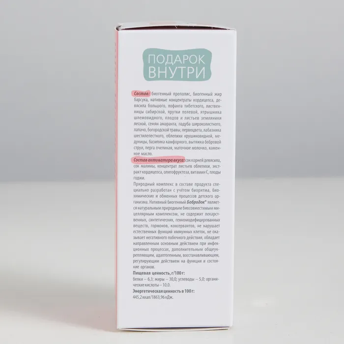 Состав: биогенный прополис, биогенный жир барсука, нативные концентраты кордицепса, девясила большого, лофанта тибетского, лиственницы сибирской, ярутки полевой, ятрышника шлемовидного, плодов и листьев земляники лесной, семян амаранта, падуба широколистного, лапачо, богородской травы, первоцвета, донника лекарственного, лабазника шестилепестного, облепихи крушиновидной, медуницы, базилика камфорного, вытяжка бобровой струи, перга пчелиная, маточное молочко, каменное масло.