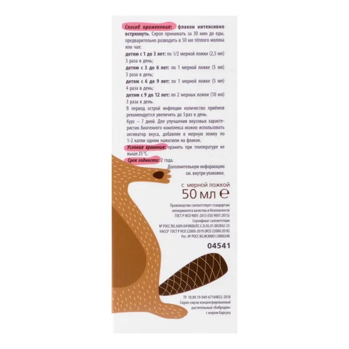 Способ применения: сироп разводится в 50 мл тёплого молока или чая, принимается за 30 мин. до еды.