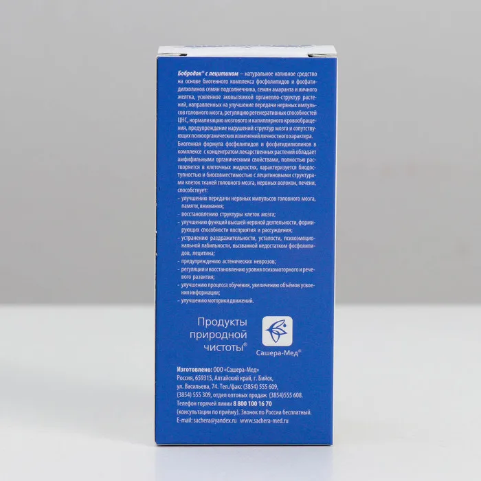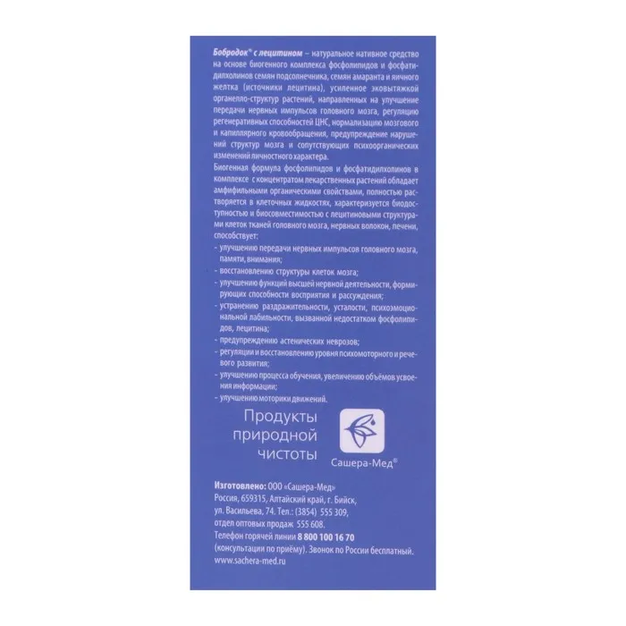 «Бобродок» с лецитином – натуральное нативное средство на основе биогенного комплекса фосфолипидов и фосфатидилхолинов семян подсолнечника, семян амаранта и яичного желтка, усиленное эковытяжкой органелло-структур растений, направленное на улучшение передачи нервных импульсов головного мозга, регуляцию регенеративных способностей ЦНС, нормализацию мозгового и капиллярного кровообращения, предупреждение нарушений структур мозга и сопутствующих психоорганических изменений личностного характера.