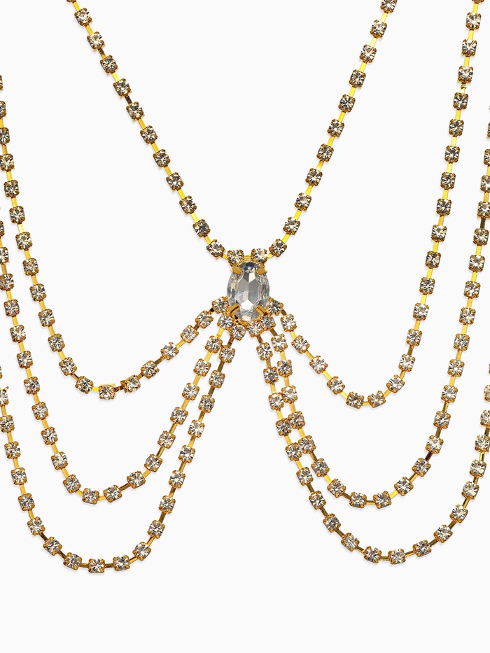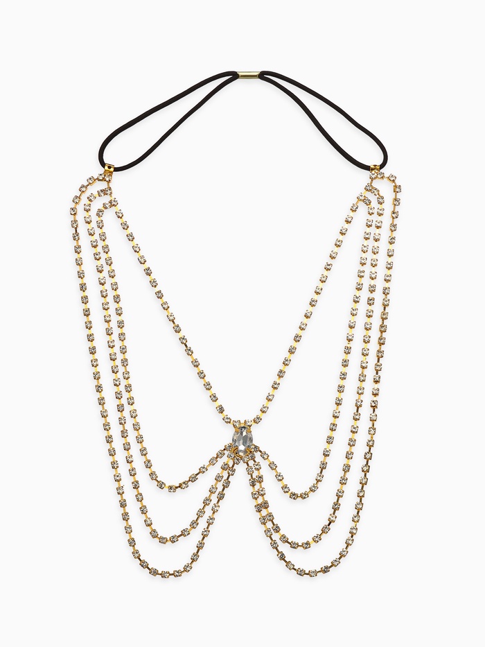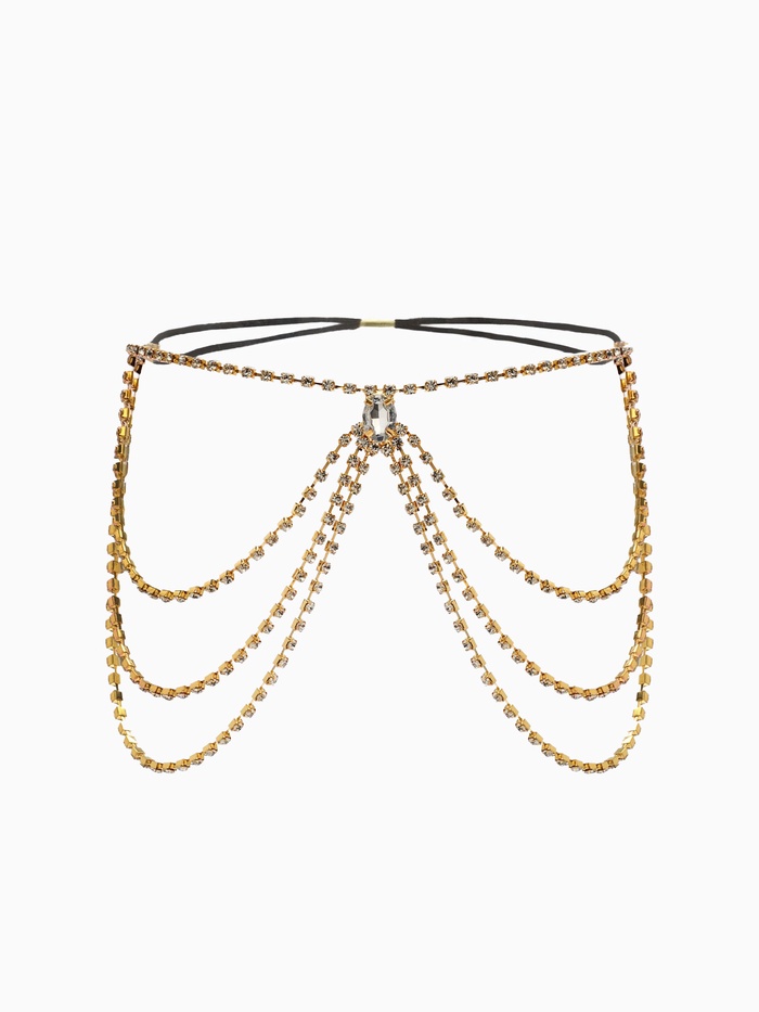 Качественные стразы надежно закреплены на эластичной основе, благодаря чему украшение остаётся целым и невредимым даже при активном использовании. По бокам расположены регулируемые замки, позволяющие подогнать размер под фигуру конкретной обладательницы. Благодаря простоте конструкции, крепление и демонтаж проходят быстро и безболезненно.