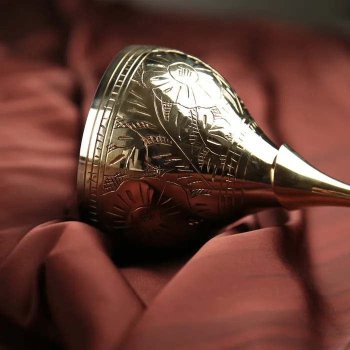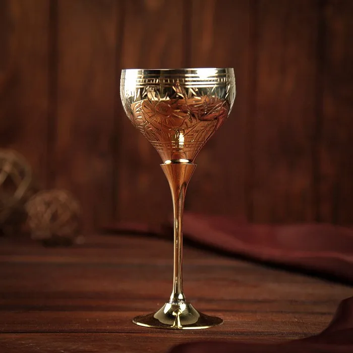 Если Вам каждый раз жаль выбрасывать осколки любимых бокалов и рюмок, при одном-единственном неосторожном движении разлетающихся на стеклянные или хрустальные брызги, Вы наверняка оцените преимущества посуды из металла. Изящный бокал для вина, 20×9×9 +/- 1 см, латунь не разобьется, если его случайно смахнут со стола, и порадует своей прочностью как хозяйку дома, так и ее гостей. Кроме того, элегантная металлическая посуда напоминает роскошное убранство королевских пиршественных столов на средневековых торжествах.
