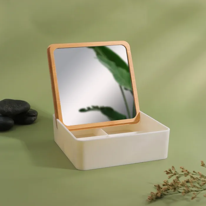 С четырьмя секциями, этот органайзер помогает хранить различные косметические принадлежности, включая кисти, помады, духи и многое другое, в идеальном порядке. Встроенное зеркало добавляет дополнительное удобство, позволяя легко корректировать макияж и всегда выглядеть на высоте. Сделанный из прочного пластика и натурального бамбука, этот бокс не только долговечен, но и привносит природные акценты в интерьер вашего дома.