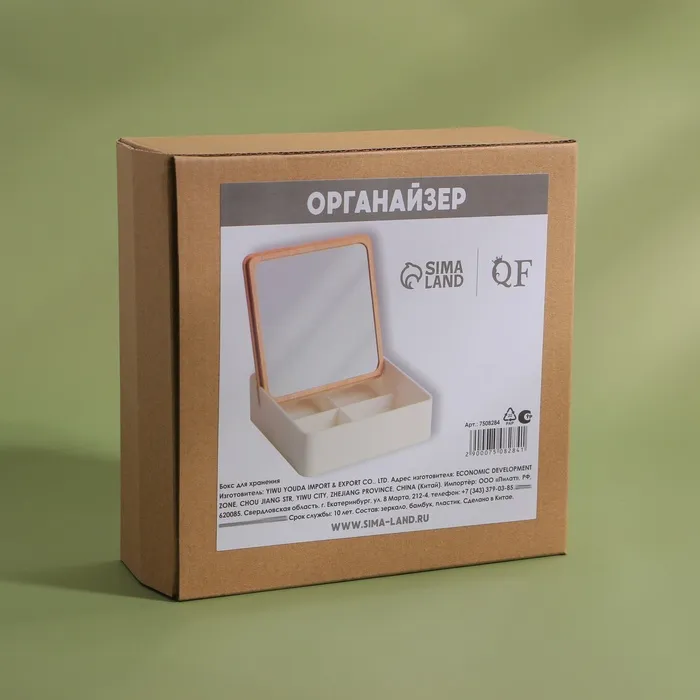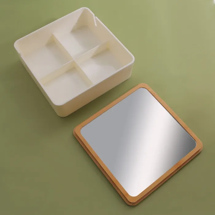 Бокс для хранения косметических принадлежностей, с зеркалом, 4 секции, 15 × 15 × 5 см, цвет белый/коричневый — Характеристики