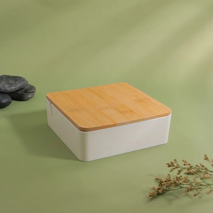 - Эстетичный дизайн: сочетание белого и коричневого цветов с натуральным бамбуком делает бокс стильным аксессуаром, который дополнит любой интерьер.