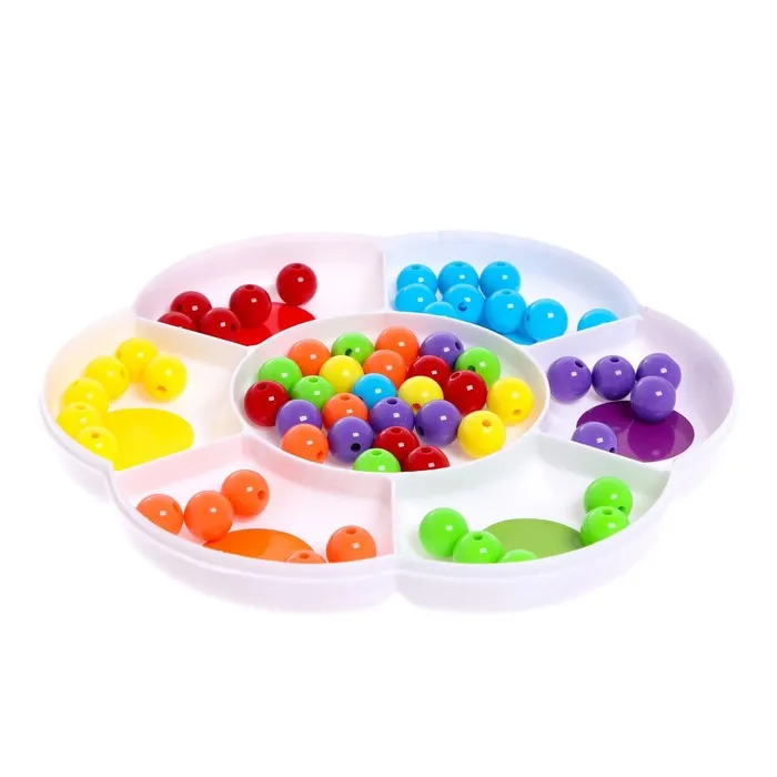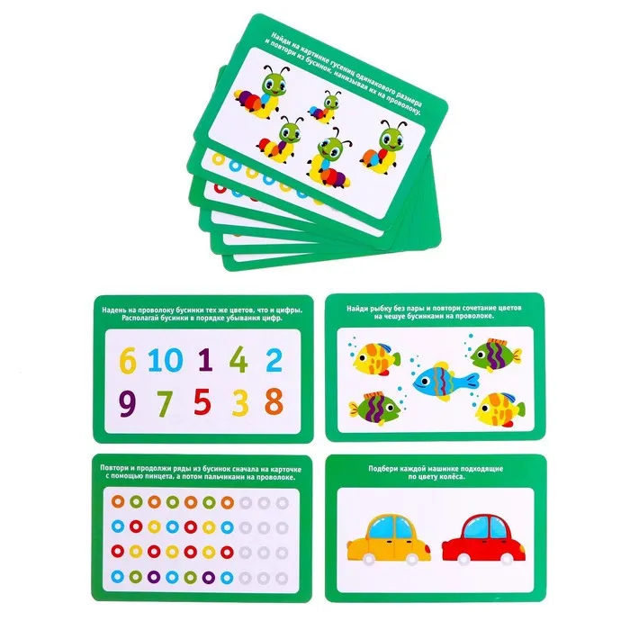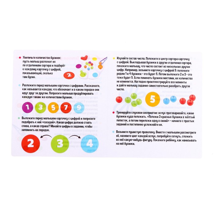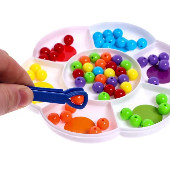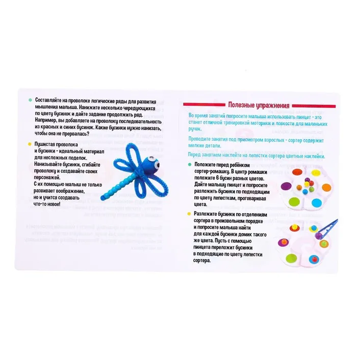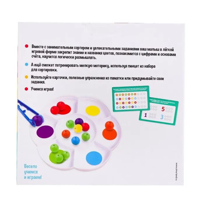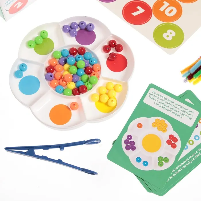 Набор разработан специально для тренировки мелкой моторики, обучения цветам и счёту. Малыш будет раскладывать бусинки по отделениям сортера-ромашки: сначала пальчиками, а потом с помощью пинцета. Процесс можно усложнять, добавляя новые задания с карточек.