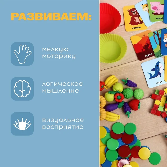 Большой развивающий набор «Для сортировки» поможет познакомить малыша с цветами, счётом, фруктами, овощами, животными.
