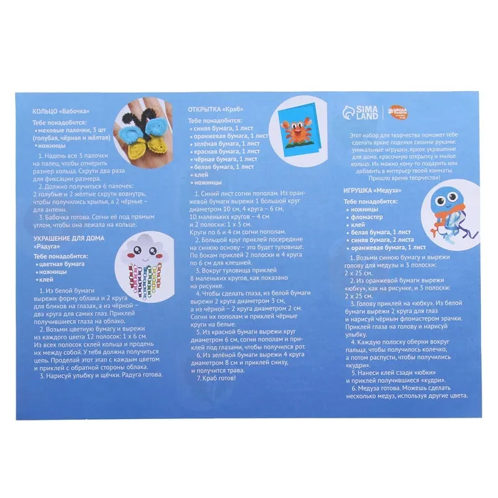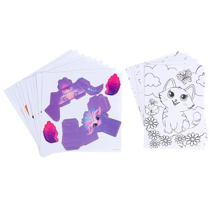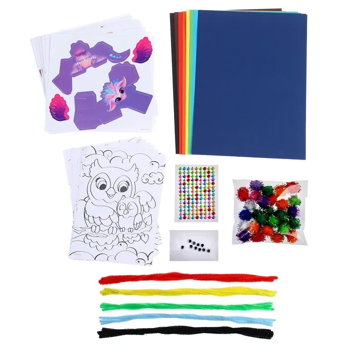 - В наборе есть всё для создания уникальных игрушек: из меховых палочек и помпошек, сложения оригами и создания объемных игрушек, яркие аппликации и сверкающие стразы.
