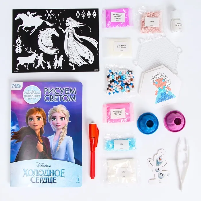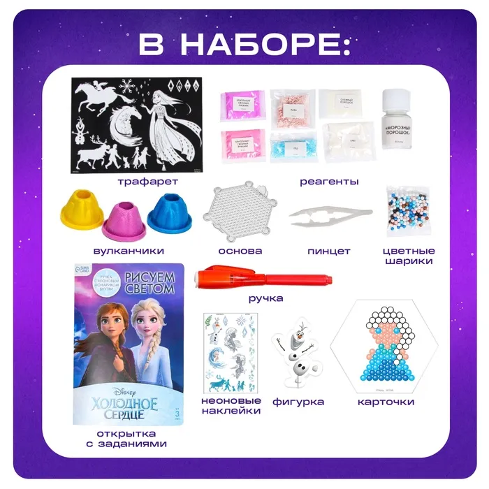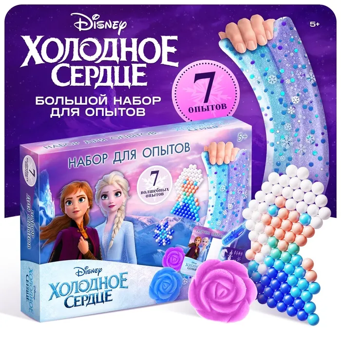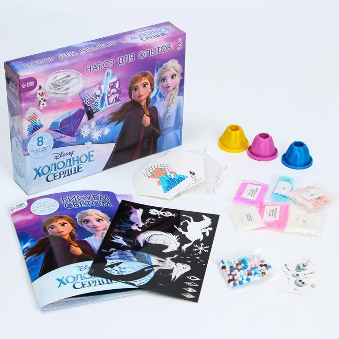 С большим набором опытов «Холодное сердце» малышка проведёт 8 новогодних экспериментов в результате которых у ребёнка появятся необычные игрушки.