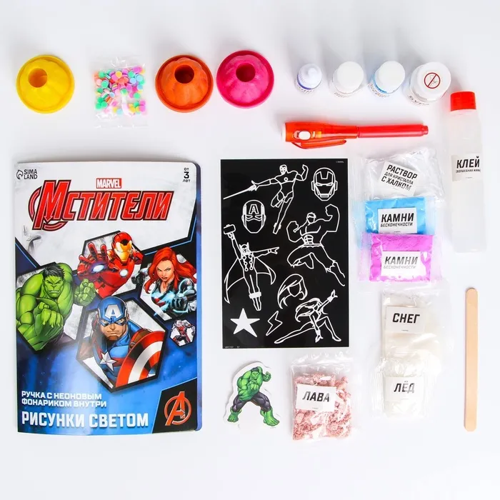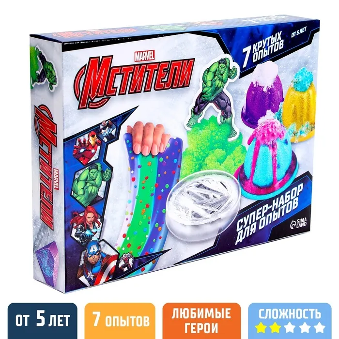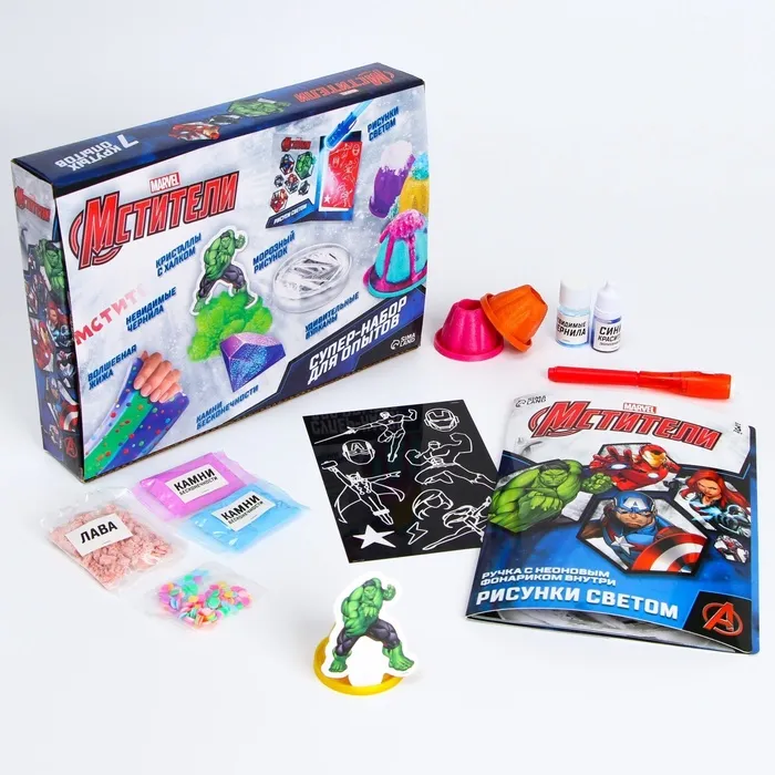 С большим набором опытов «Мстители» ребёнок сможет провести 7 крутых опытов, в результате которых у него получатся необычные игрушки.