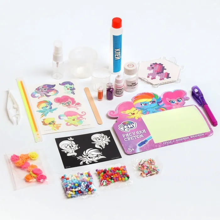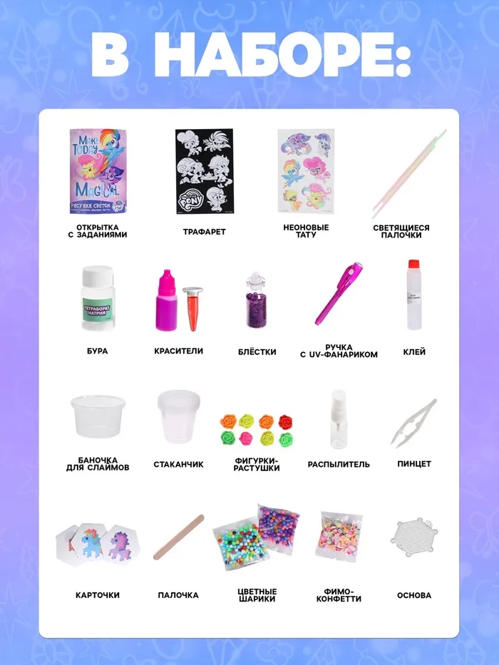 С большим набором опытов My Little Pony ребёнок проведёт 7 интересных экспериментов в результате которых у ребёнка появятся необычные игрушки.