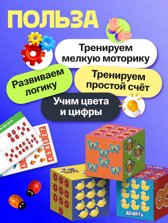 - Игровые кубики, которые помогают развивать моторику и знакомят с числами.