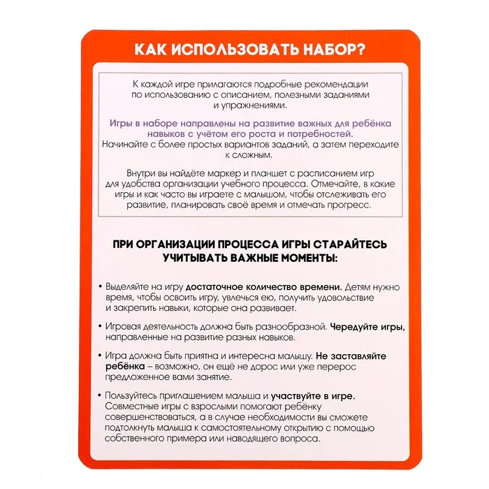 В большой набор входит 7 игр, основанных на различных методиках всестороннего развития. К каждой игре прилагаются подробные рекомендации по использованию с описанием, полезными заданиями и упражнениями. Игры в наборе направлены на развитие важных навыков ребёнка с учётом его потребностей.