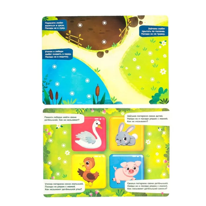 - Животные на липучках. Занятия с этим игровым набором — отличный способ познакомить ребёнка с названиями животных и их детёнышей и развить его кругозор.
