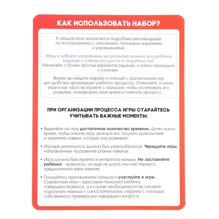 В большой развивающий набор входит 6 игр, основанных на различных методиках всестороннего развития. К каждой игре прилагаются подробные рекомендации по использованию с описанием, полезными заданиями и упражнениями. Игры в наборе направлены на развитие важных навыков ребёнка с учётом его потребностей.