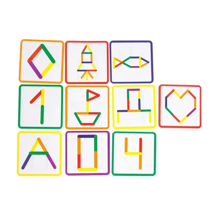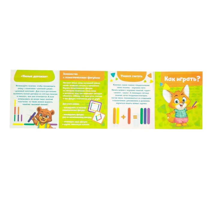 - Деревянные палочки. Набор включает в себя деревянные палочки и карточки-схемы для развития логического мышления и цветовосприятия.