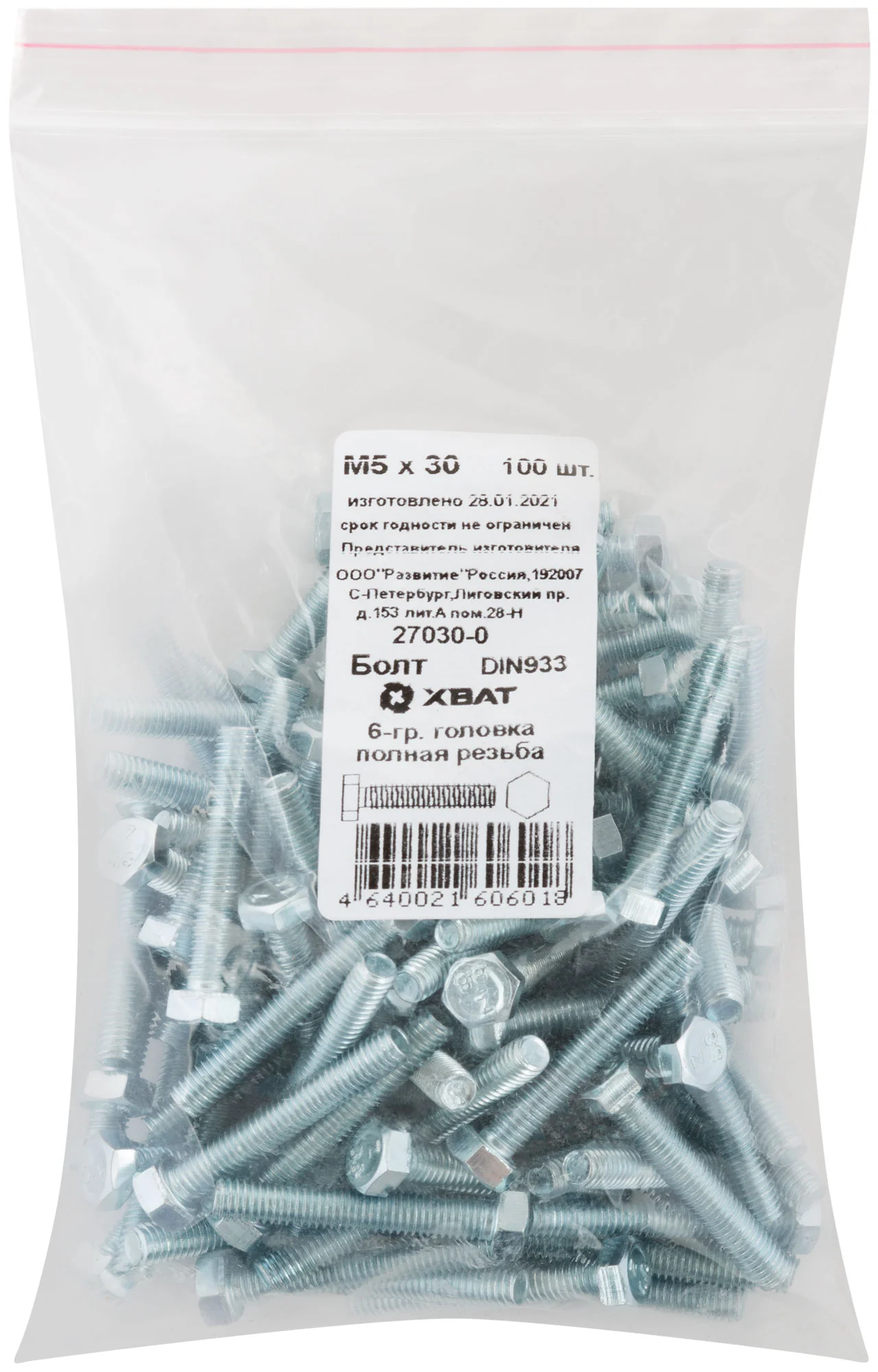 Болт 6-гранная головка (полная резьба) М5 х 30 100 шт DIN933 Фасовка