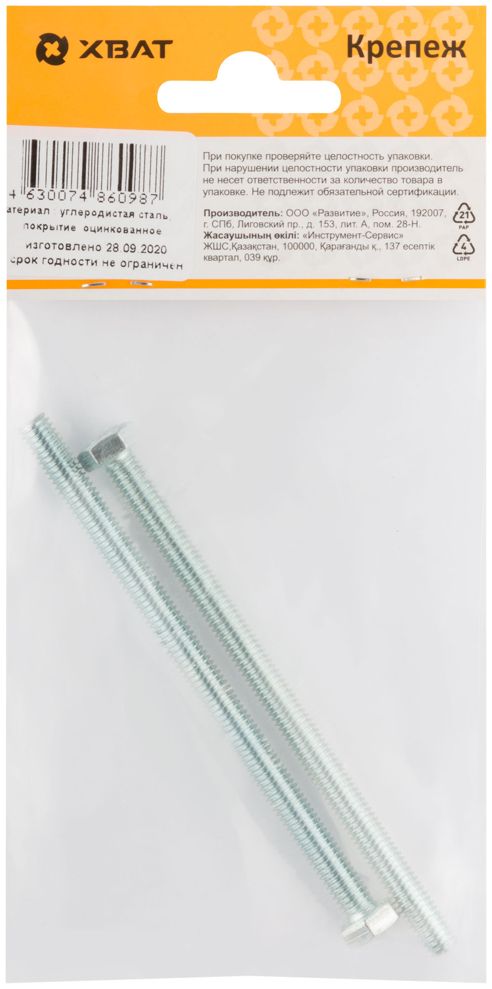 Изготовлен из конструкционной оцинкованной стали, что обеспечивает долговечность и устойчивость к коррозии. Полная резьба позволяет использовать болт в различных условиях и для разных задач.