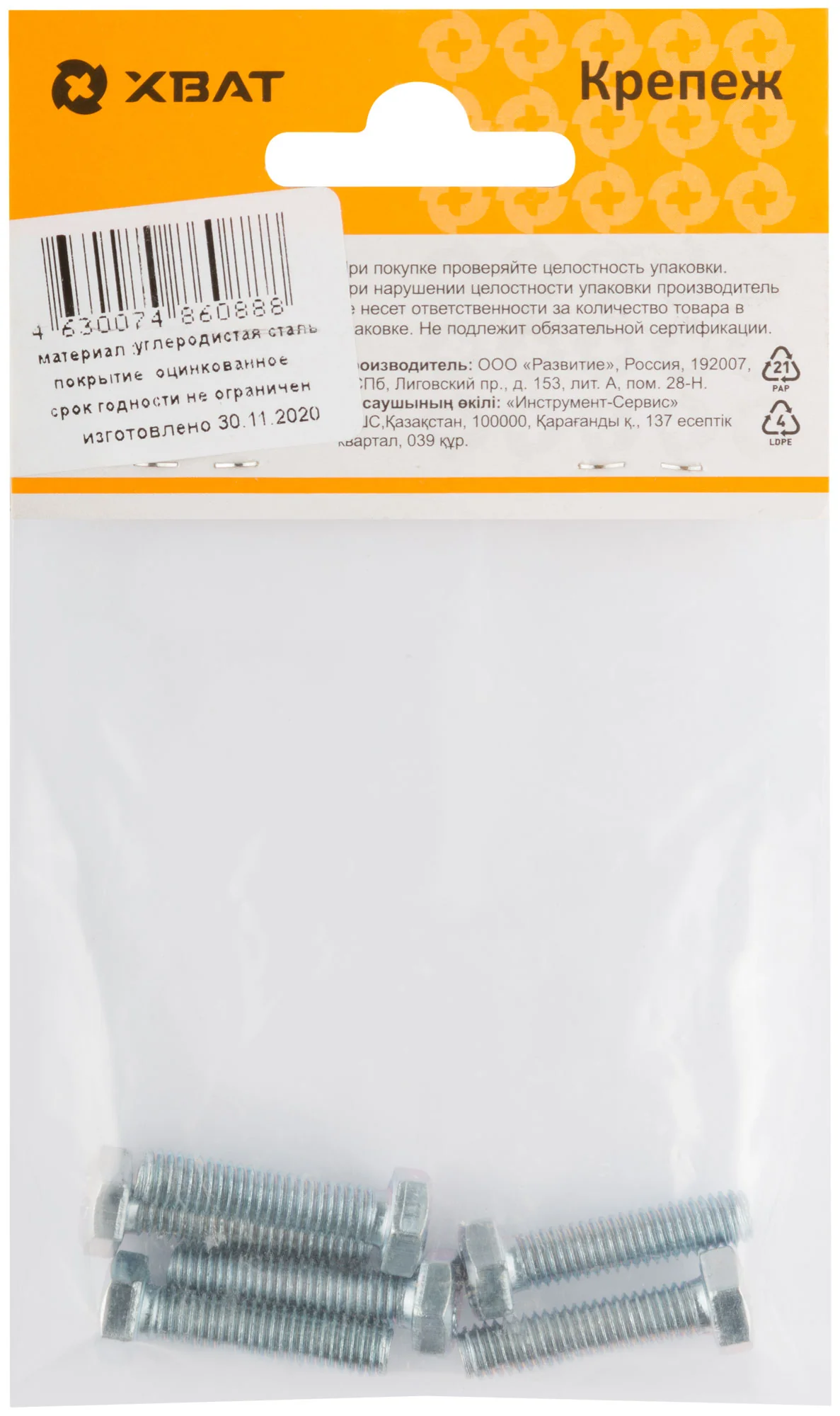 Болт изготовлен из конструкционной оцинкованной стали с классом прочности 8.8, что обеспечивает его надежность и долговечность в эксплуатации. Продукт произведен в России и соответствует стандарту DIN933.