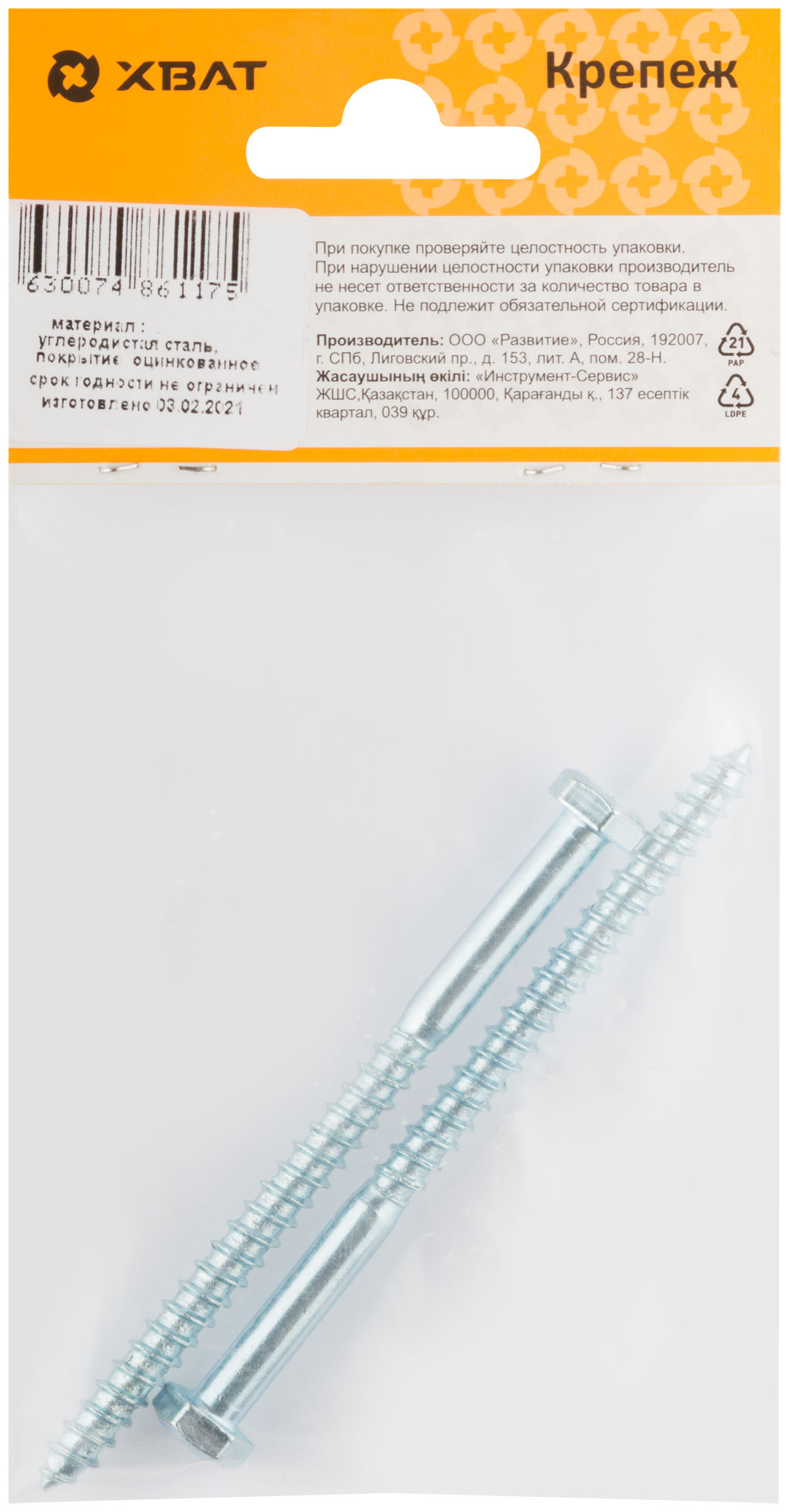 Болт имеет шестигранную головку и изготовлен из прочной стали с оцинкованным покрытием, что защищает его от коррозии. Он обладает редким шагом резьбы под углом 60°, что обеспечивает крепкое соединение. Остроконечный наконечник облегчает ввинчивание в материал.