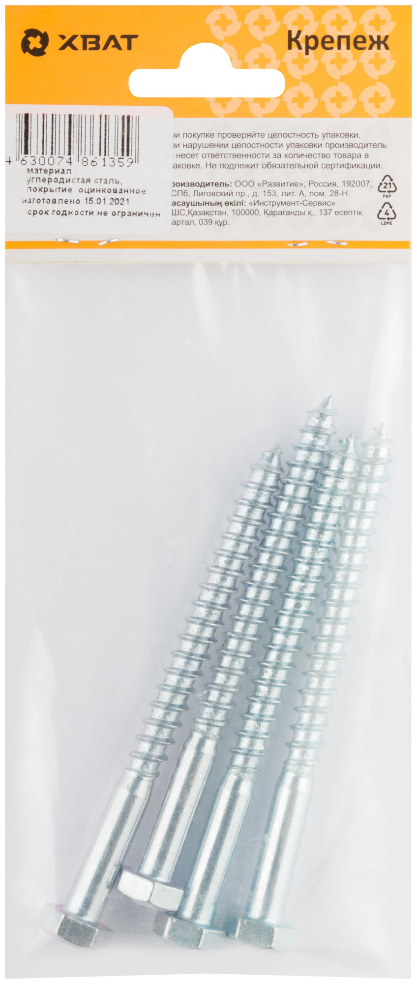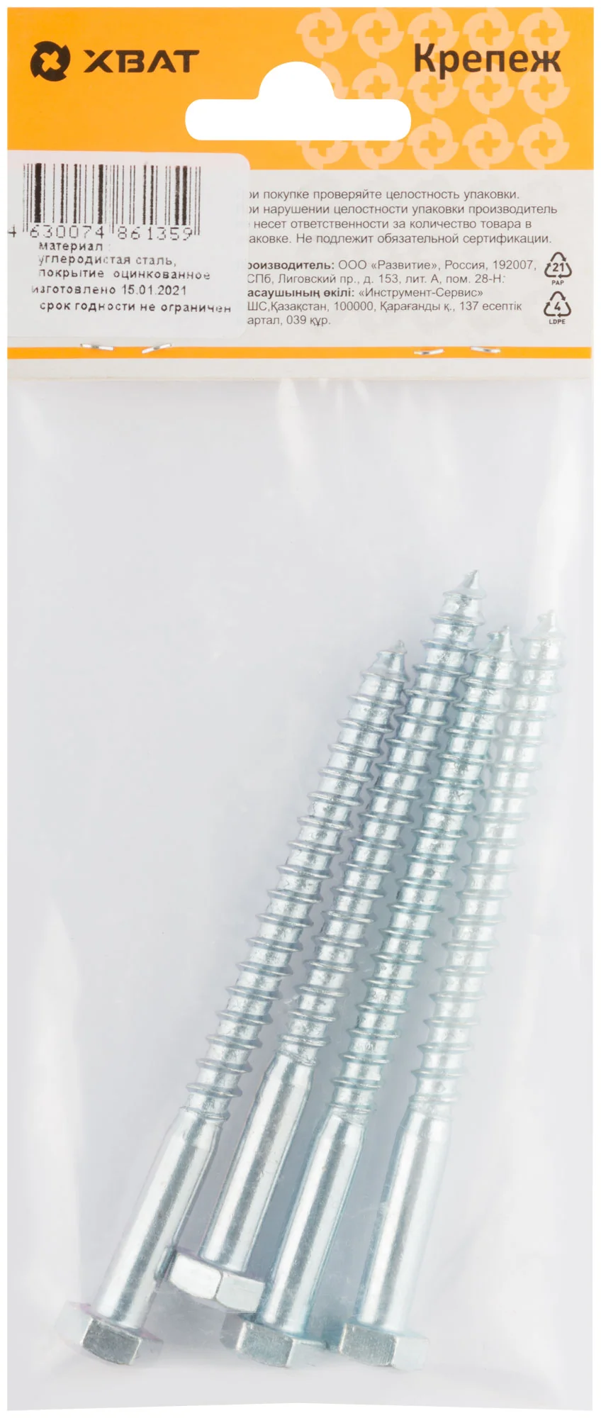 Болт изготовлен из стали и имеет оцинкованное покрытие, что обеспечивает долговечность и устойчивость к коррозии. Оснащен шестигранной головкой и острым наконечником для легкости установки.