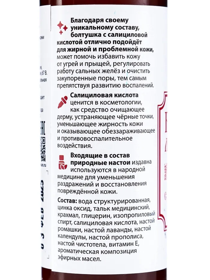 Благодаря своему уникальному составу, болтушка с салициловой кислотой отлично подойдёт для жирной и проблемной кожи, может помочь избавить кожу от угрей и прыщей, регулировать работу сальных желёз и очистить закупоренные поры, тем самым препятствуя развитию воспалений. Салициловая кислота ценится в косметологии, как средство очищающее дерму, устраняющее чёрные точки, уменьшающее жирность кожи и оказывающее обеззараживающее и противовоспалительное воздействия. Входящие же в состав природные масла и экстракты издавна используются в народной медицине для уменьшения раздражений и восстановления повреждённой кожи.
