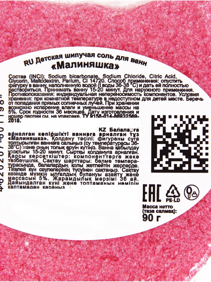 Состав (INCI): Sodium bicarbonate, Sodium Chloride, Citric Acid, Glycerin, Maltodextrin, Parfum, Сl 14720.