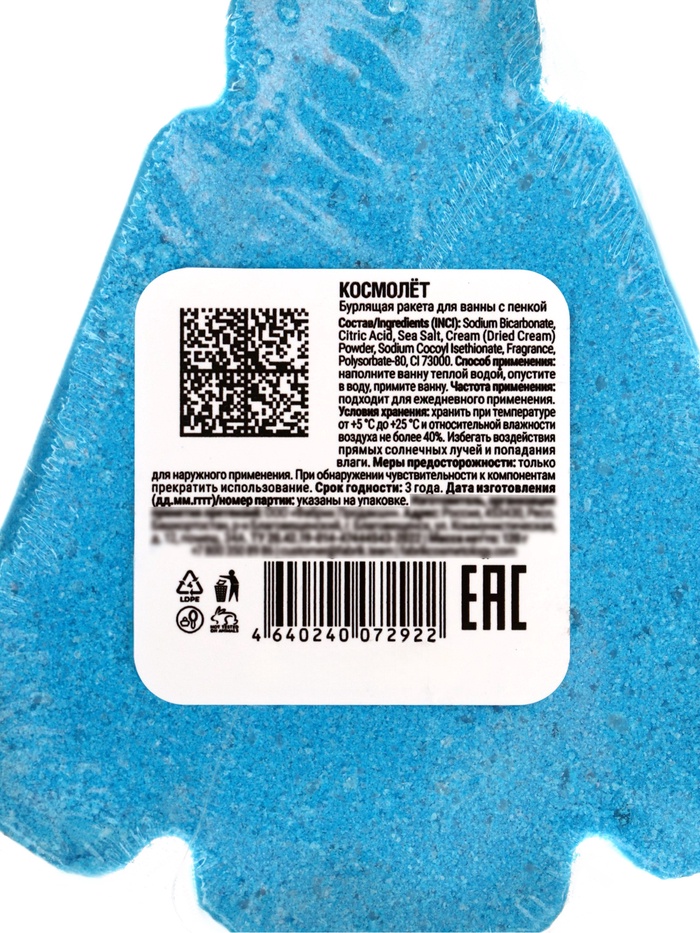 (Бикарбонат натрия, лимонная кислота, морская соль, сухие сливки, содиум кокоил изетионат, отдушка, ПАВ, пищевой краситель).