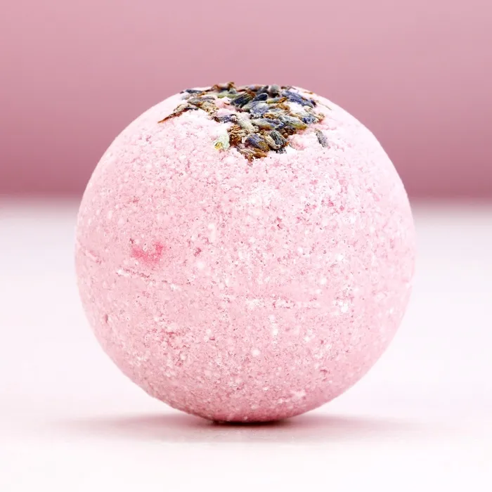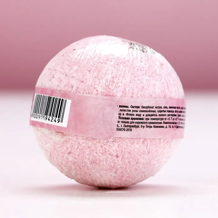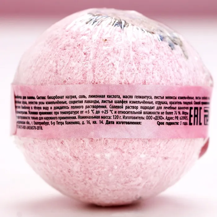 Состав: бикарбонат натрия, соль, лимонная кислота, масло гелиантуса, соцветия лаванды, отдушка, краситель пищевой.