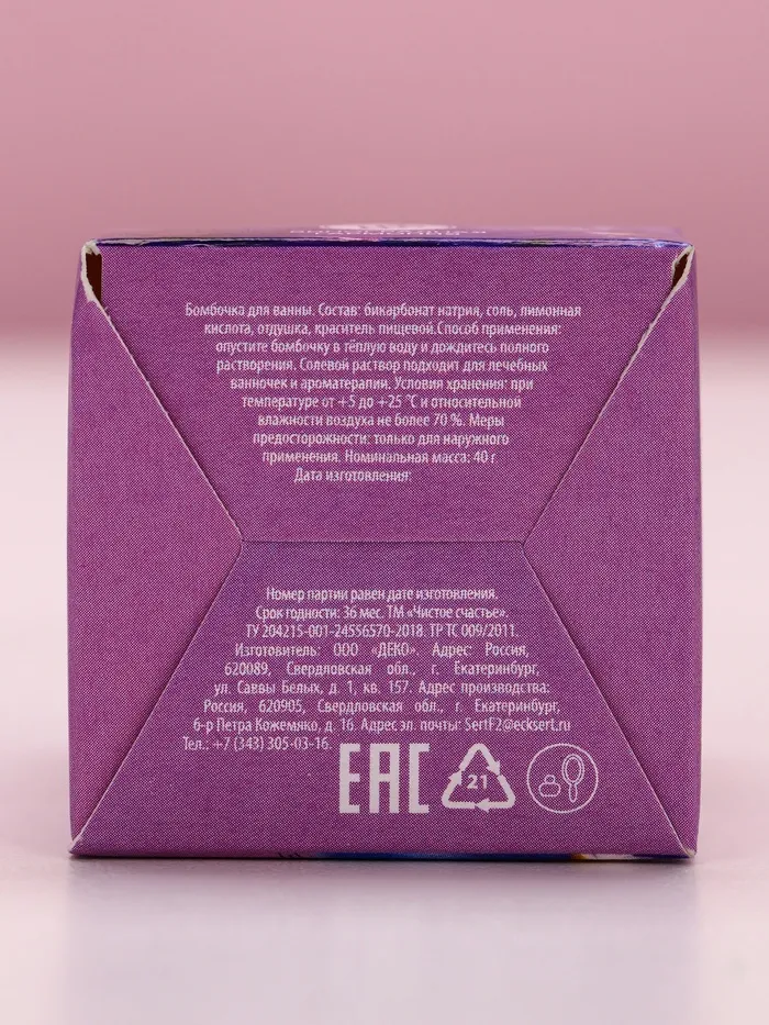 Бомбочка для ванны «Самой милой, нежной», 40 г, аромат винограда, Чистое счастье — Характеристики
