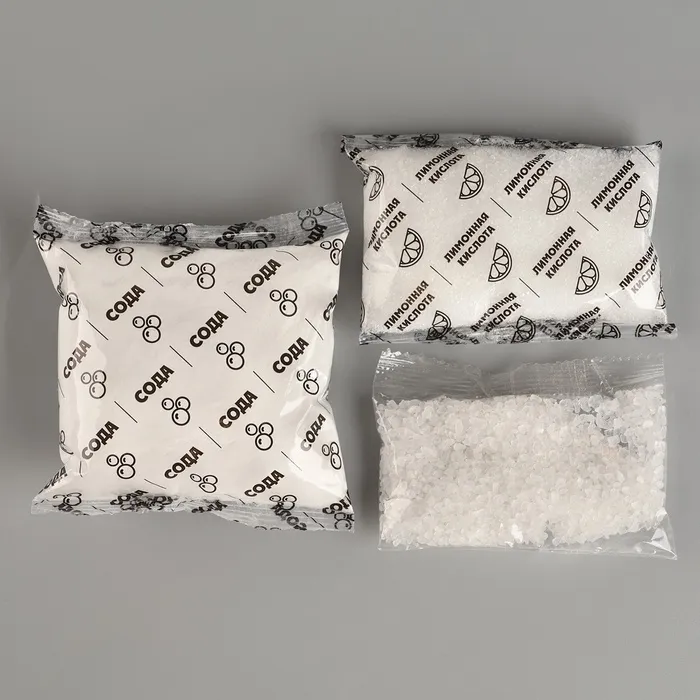 - В первой миске смешай соду и лимонную кислоту. Во второй – морскую соль, краситель и отдушку, смесь перемешай.