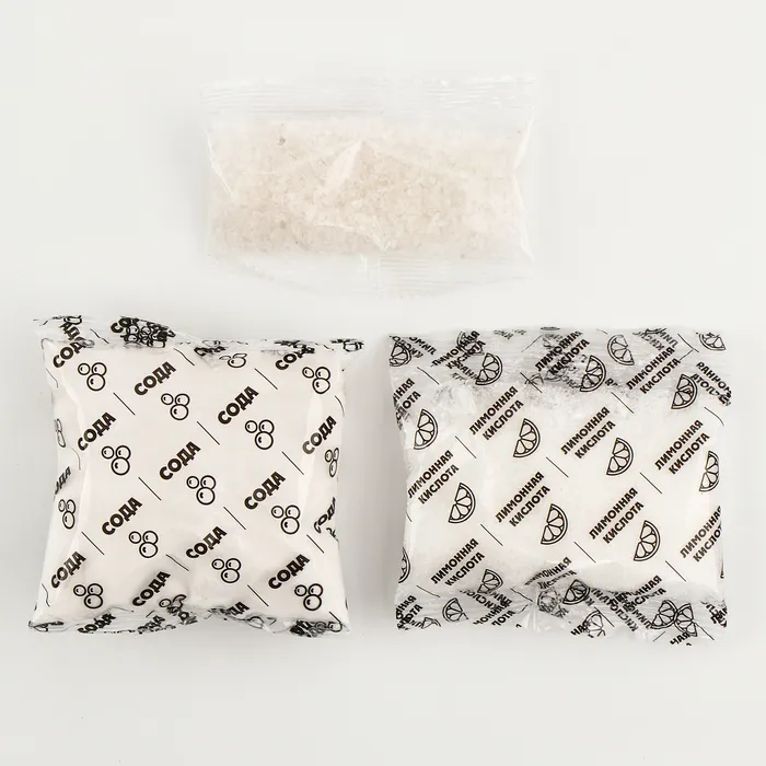 - В первой миске смешай соду и лимонную кислоту. Во второй – морскую соль, краситель и отдушку, смесь перемешай.